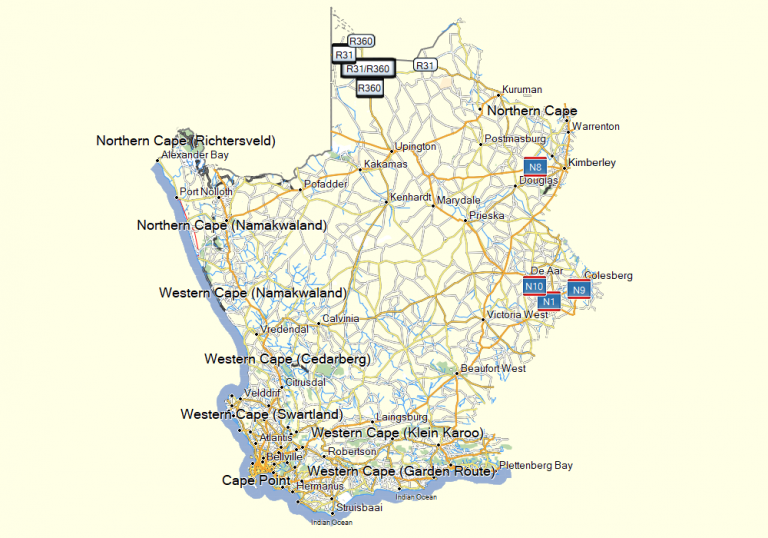 Kartenstil und Abdeckung der T4A-Karte „westliches und nördliches Kap“ von https://tracks4africa.de/ , Abbildungen von dort.